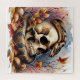 The fall leaves, slithering reptile, and skull are all in a warm and neutral colour scheme of orange, red, brown, dark yellow, and beige.