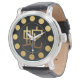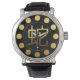 Golden Snake Symbol with an embossed digital effect in the centre of a black frame with hollowed-out circles showing the golden background for hours. Design on man vintage style watch. You can easily change background colour and add text by clicking the customise button. Matching charm bracelet, wrapping paper, tissue paper, ribbon, favour box, greeting card and more... Perfect for Chinese New Year of The Snake 2025 or Birthday (people born in Snake year). ------- "The Snake (蛇) is one of the 12-year cycle of animals which appear in the Chinese zodiac and related to the Chinese calendar, as well as in related East Asian zodiacal or calendrical systems. The Year of the Snake is associated with the Earthly Branch symbol 巳 (...) People born within these date ranges can be said to have been born in the "Year of the Snake", while also bearing the following elemental sign: