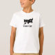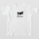 A sneaky looking cat with black fur and gray patches. A neat saying 'cool cat'. The saying on this t-shirt can be changed to something else if so desired.