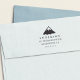 Elegant return address design features a snow capped mountain peak illustration, with your family name and return address details beneath in classic block and italic lettering.