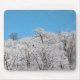 A light snowfall has left a white coating on a hillside of trees. The blue sky adds a distinct contrast to the scene.