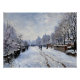 "Snow at Argenteuil" is a serene winter landscape that depicts a quiet street in Argenteuil blanketed in snow. The composition features a central pathway flanked by snow-covered houses and trees, rendered with loose and expressive brushstrokes. The cool colour palette of whites, blues, greys, and purples captures the soft, diffused light of an overcast winter day, creating a tranquil and atmospheric scene. Small, indistinct figures in the background add a sense of scale and human presence without drawing focus away from the peaceful landscape.