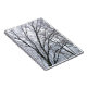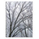 Snow-covered branches fill the photograph making it almost an abstraction. In the foreground, a dark oak tree trunk splits into many limbs starting near the bottom left of the frame and reaching up and across to the right. The near black trunk provides a graphic element to the image. The oak tree still has quite a few brown leaves on it. The sky in the background is white. A chaotic and intriguing winter scene.