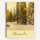 A personalised spiral notebook with a beautiful nature photograph. An isolated winter path with tall snow covered pine trees.