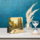 A photo plaque with a beautiful nature photograph. An isolated winter path with tall snow covered pine trees.