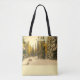 A tote bag with a beautiful nature photograph. An isolated winter path with tall snow covered pine trees.