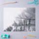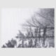 Immerse yourself in a winter wonderland with the vertical black and white photograph, Snow-covered Trees. The treetops form a strong diagonal with the tallest tree starting at the upper left corner of the image and the shortest tree at the bottom third of the right edge. The two trees on the left are evergreens while the rest are leafless deciduous trees; all are covered with snow. The sky above them is white.