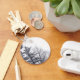 Immerse yourself in a winter wonderland with the vertical black and white photograph, Snow-covered Trees. The treetops form a strong diagonal with the tallest tree starting at the upper left corner of the image and the shortest tree at the bottom third of the right edge. The two trees on the left are evergreens while the rest are leafless deciduous trees; all are covered with snow. The sky above them is white.