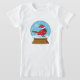 An illustration of a snow globe with a cute red cardinal wearing a red santa claus bonnet under a snow in a bright blue sky. This cute cartoon christmas waterglobe design is a gift idea for winter holiday lovers and, bird and animal lovers.