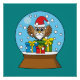 An illustration of a snow globe with santa claus owl wearing a red bonnet and long white beard with his three colourful presents for Christmas. This cute cartoon kawaii wateglobe design is a gift idea for winter holiday lovers, snowdome lovers and xmas lovers.