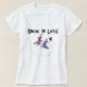 Two snowmen wearing winter scarves hold a red heart and text reads Snow in Love on snowman design holiday t-shirts, tote bags, cards, stickers, magnets, and other snowman design apparel and gifts.