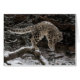 Snow leopard cub leaps off a tree to pounce into the snow.