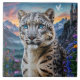 Snow Leopard in wildflowers in a valley surrounded by Mountains