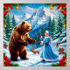 A magical winter landscape featuring a Snow Maiden dressed in a blue gown interacting with a beer. Snow-covered mountains and festive decorations enhance the seasonal and peaceful atmosphere.