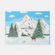 Winter scene with snowy mountains, rustic cabin and a buck overlooking the valley below him. Original artwork by W.B.