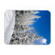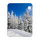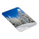 Vertical photo magnet of snow on the trees under a blue sky in a ski resort area in winter on a clear sunny winter day.