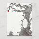 Black and white hand drawn image with red apple dangling from a gnarled branch.
