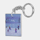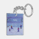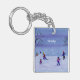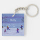 A watercolor painting of a children having a snowball fight adorns this customisable keychain!