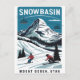 A vintage-style illustration depicting skiers enjoying the slopes at Snowbasin ski resort in Mount Ogden, Utah.