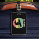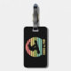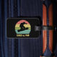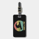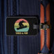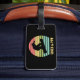 A retro cool luggage tag with a snowboarding theme. Featuring a snowboarder silhouette set against a colourful vintage sunset. Along with the words "shred the pow", a common snowboarding phrase.
