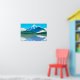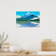 Poster in a digital painting of snow-capped mountains and pine forest, reflected in a lake, under a deep blue sky