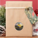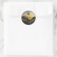 A sticker with an eagle flying over a mountain, in the style of contemporary landscape, golden light, black mountain college, fisheye lens, arts and crafts movement, mid-century illustration