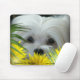 A photograph of Snowdrop, a sweet little Maltese, peeping through some Sunflowers.