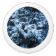 Snowfall in the forest. Snowflakes in the air. Snow covered Christmas tree. Blue and green colours, winter mood. Merry Christmas and Happy New Year to you and yours!