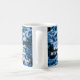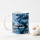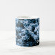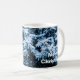 Snowfall in the forest. Snowflakes in the air. Snow covered Christmas tree. Blue and green colours, winter mood. Merry Christmas and Happy New Year to you and yours! Funny coffee mug.