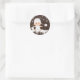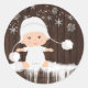 Snowflake baby shower stickers with adorable baby wearing a cute white snow outfit and hat on a rustic snowflake background. You can add text to personalise these cute winter baby shower stickers.