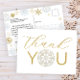 Share your gratitude with this elegant winter thank you postcard, featuring shimmering gold script and a delicate snowflake centerpiece. The double-sided design includes space for a heartfelt message and mailing address, making it both beautiful and practical. Perfect for winter baby showers, holiday showers, and little snowflake celebrations. Coordinates seamlessly with the full Snowflake Baby Shower collection for a cohesive Winter Wonderland theme.