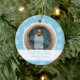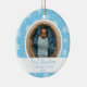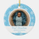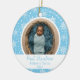 Beautiful snowflake design on a blue background with an area to add a photo, baby's name, and birth year. This is a cute way to celebrate your baby's first Christmas.