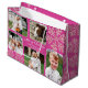 These large Christmas gift bags personalised with up to 5 of your family photos are designed in a rich dark pink with faux glitter pink snowflakes and your custom text for one of a kind gift presentations. The simple collage design of photos is easy to customise - upload your photos into the design where they will appear with slightly rounded corners and a border of white. Two text templates in white are equally easy to personalise - Merry Christmas in a pretty script font can be changed to Merry & Bright, Happy Holidays (or Happy Birthday for winter celebrations) and the smaller block text, up to two lines, is perfect for a short greeting and either your name or the name of the recipient. Pink faux sparkle snowflakes are scattered on the deep berry pink background in and amongst the photos and along the sides. The 5 photo design is repeated on the back side of these large dark pink Christmas gift bags. Delight family and friends with these one of a kind holiday gift bags featuring treasured photos and the Christmas colour trend of pink, dark luscious raspberry pink.