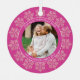 Create your own chic 2 photo Christmas ornaments with this double sided pink snowflake design and a pop of dark berry pink. Each side of this round metal ornament features your photo magically transformed into a round shape with two sets of white text curving over and under the pictures. A ring of faux glitter pink snowflakes decorate the outside border for a fun yet elegant touch. Each custom holiday ornament is setup with templates so you can personalise each side differently or you can repeat the front on the back if you prefer. Add your two favourite photos to these deep raspberry pink and snowflake unique Christmas ornaments and create personalised gifts and one of a kind keepsakes for yourself, for your family and for your very best friends.
