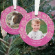 Create your own photo keepsakes with these cute double sided 2 photo Christmas ornaments in a deep berry pink with faux glitter pink snowflakes for a little bling. These dark pink round acrylic holiday ornaments are designed to be easy to personalise by adding your photos and text using the templates provided. Upload your photo into the front ornament design and watch it turn into a round picture with a thin white border and a cascade of pink faux sparkle snowflakes behind. Two lines of curved text at the bottom in a simple white text allows you to easily title your photo, adding a name and year or other short wording. The back of each personalised Christmas ornament is the same as the front but with different templates so you can choose to add the same photo and title or a second one with different text if you like. These one of a kind custom ornaments featuring your photos plus the added fun of deep raspberry pink and faux glitter snowflakes are perfect for your tree as well as unique Christmas gifts for friends and family.