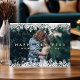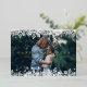 Elegant and modern holiday card design features your favourite horizontal or landscape orientated photo framed at the top and bottom by a border of white snowflake illustrations. "Happy New Year" appears in modern lettering as a gold foil text overlay in the centre, with your name(s) and the year beneath. To reposition text elements, use the Customise or Personalise feature.