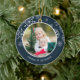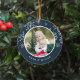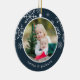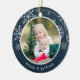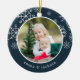 Festive photo Christmas ornament features a favourite photo on each side, framed by white snowflakes on vibrant jewel toned navy blue. Personalise with a custom caption on each side; shown with names and the year.