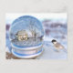 Inside a snow globe is a winter landscape with a cottage overshadowed by bare maple and cherry trees. Snow glitters on the lawn, holly bushes covered with bright red berries flank the door, and snowflakes tumble through the frozen air. Beside the globe a little chickadee looks curiously in at the miniature scene.