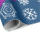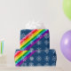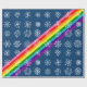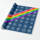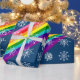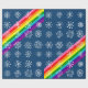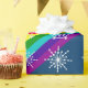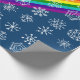 Very cool gift wrap in deep midnight blue covered in white snowflakes and with a streak of rainbow colours.