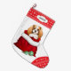 An adorable little Cavalier King Charles Spaniel puppy pops out of a red gift bag on the front of this Christmas stocking. A few teal and gold pattern Holiday tree bulbs lay just in front of the Santa bag The image is placed on a white background, and the toe and top border are a red and white snowflake pattern. On the top border is a white label with your custom text in dark grey. The back of the stocking has the same red and white snowflake pattern.