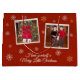 Super cute, large Christmas gift bag has a textured red background paper and 2 frames for a few of your favourite family photos. Cute white snowflakes are scattered about. The bottom says "Have Yourself a Merry Little Chrstmas, which can be changed to anything you like to personalise it for your family. The reverse side of the bag says "With Love From Our Family To Yours" (which can also be changed) and a place for your names. Other sizes are available in the shop.