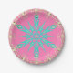 A pretty, diamond look studded snowflake done in a mid century style. This turquoise snowflake is set on a pink background and framed with an ornate, jewel look light gold frame.