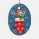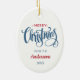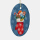 This festive Holiday ornament makes a nice gift for neighbours, friends, and family. The front has an image of a red and white snowflake decorated mitten filled with lots of Christmas goodies, including candy canes, gift packages, an orange slice, and gold bells. The image is placed on a blue snowflake background. The back is solid white, with stylised text in red and blue that says "MERRY CHRISTMAS". Your signature text is in three fields below. Bright and colourful!