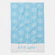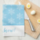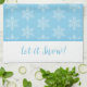 This winter-themed kitchen towel, a seasonal addition to your kitchen decor. A white snowflake pattern on a light blue background and the phrase - Let it Snow!