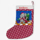 On both sides of this stocking, it is set against a background of festive red with a nice snowflake pattern.
