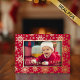 Modern, classic and traditional winter wonderland with foil falling snowflakes on a red background. The foil options are Gold, Silver and Rose Gold. Customise the text, the back text is optional, or delete. A keepsake for new parents, family and friends.