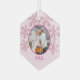 Create your own keepsake Christmas ornament by adding your photo into the faux glitter pink snowflake and light pink design on this glass hexagon ornament. Upload your photo and watch it transform into a round picture with a dark berry pink border. Matching deep pink text at the bottom is the perfect place to add the year or MERRY if you prefer or remove it entirely if you wish. A sprinkle of faux sparkle snowflakes on the blush pink background is the finishing touch on this personalised ornament, perfect for your holiday tree or as a gift for family and friends.