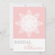 Snowflake pink, white winter wedding bridal shower invitation, featuring a white snowflake on soft pink background. A perfect choice for classy winter December Christmas weddings. Some elements courtesy of vectorportal.com. This modern wedding template design is completely customisable that can be personalised and is part of a wedding set. Colour scheme: Pink, white, grey/grey.
