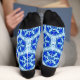 Socks in a geometric, honeycomb quilt pattern of snowflakes in deep cobalt blue and white, accented with turquoise