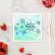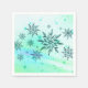 Blue and silver snowflakes riding on a turquoise and blue swirly winter breeze. Set on a white background. Fun and delicate design.